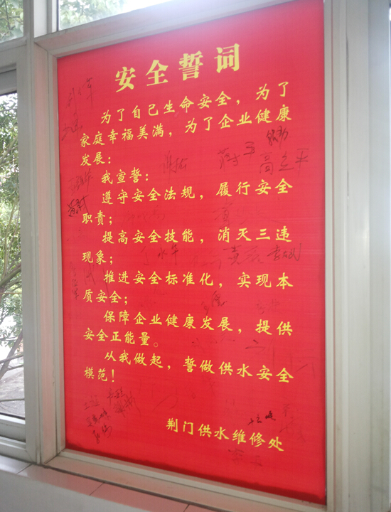維修處維修工作點(diǎn)多面廣,施工環(huán)境日益復(fù)雜,安全生產(chǎn)形勢面臨嚴(yán)峻挑戰(zhàn)。抓好安全生產(chǎn)各項工作是維修處一直常抓不懈的一項重要工作,而探討不拘一格的安全生產(chǎn)管理模式和多渠道、多形式的全員安全教育培訓(xùn)方式也一直是維修處創(chuàng)新安全管理方式、適應(yīng)安全管理新常態(tài)的重要舉措。全員安全宣誓是我處今年安全生產(chǎn)月的一大亮點(diǎn),全體人員由處領(lǐng)導(dǎo)帶隊在宣誓墻下莊嚴(yán)宣誓:“為了自己生命安全,為了家庭幸福美滿,為了企業(yè)健康發(fā)展,我宣誓……從我做起,誓做供水安全模范!”