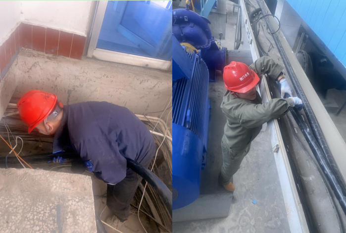 從中壓泵房變頻柜敷設(shè)200多米的電纜至送水泵房泵機,途徑1米高的電纜隧道和5米高的電纜夾層,由于隧道內(nèi)部空間狹小,人在其中只能彎著腰蹲著作業(yè),多處轉(zhuǎn)彎,也給工作帶來不小的難度,但大家充分發(fā)揮水務(wù)人“特別能戰(zhàn)斗”的精神,齊心協(xié)力,最終歷時3小時完成任務(wù)。