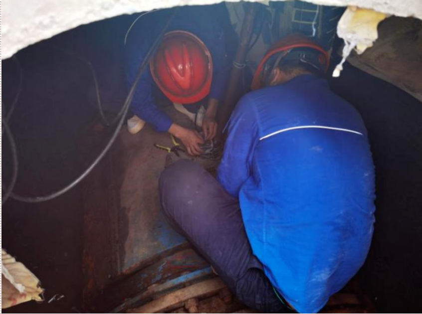 廠領(lǐng)導(dǎo)在綜合評估后,同意其思路,并作安全操作提醒。雖早有心理準備,但在打開接線盒后的瞬間,李為龍等人還是倒吸一口涼氣。他們發(fā)現(xiàn)整個接線盒內(nèi)部被深色不透明的膠體充滿,無法掌握線路走向。短暫思索后,他們發(fā)揮水務(wù)人不怕苦、能戰(zhàn)斗的精神,嘗試按廠家給出建議,用熱風(fēng)槍加熱密封膠,但事與愿違,效果并不理想,密封膠沒有自動融化流出。李為龍“改巧為笨”,在加熱的同時用小刀清理變軟的膠體。該處操作空間狹小,且不能損壞內(nèi)部的線路和接線端子,必須凝神聚力,是個“精細活”“體力活”。即便同事們輪番上陣,依然個個汗如雨下。功夫不負有心人,眾人合力熬過“漫長的”4小時,最終完成了既定任務(wù)。