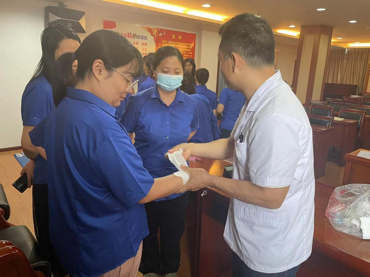 黃主任結合集團實際,講解了燒傷急救、毒蛇咬傷、狂犬咬傷等外傷急救基本技術,并現(xiàn)場示范包扎止血的方法,以及轉(zhuǎn)運受傷病人的注意事項。