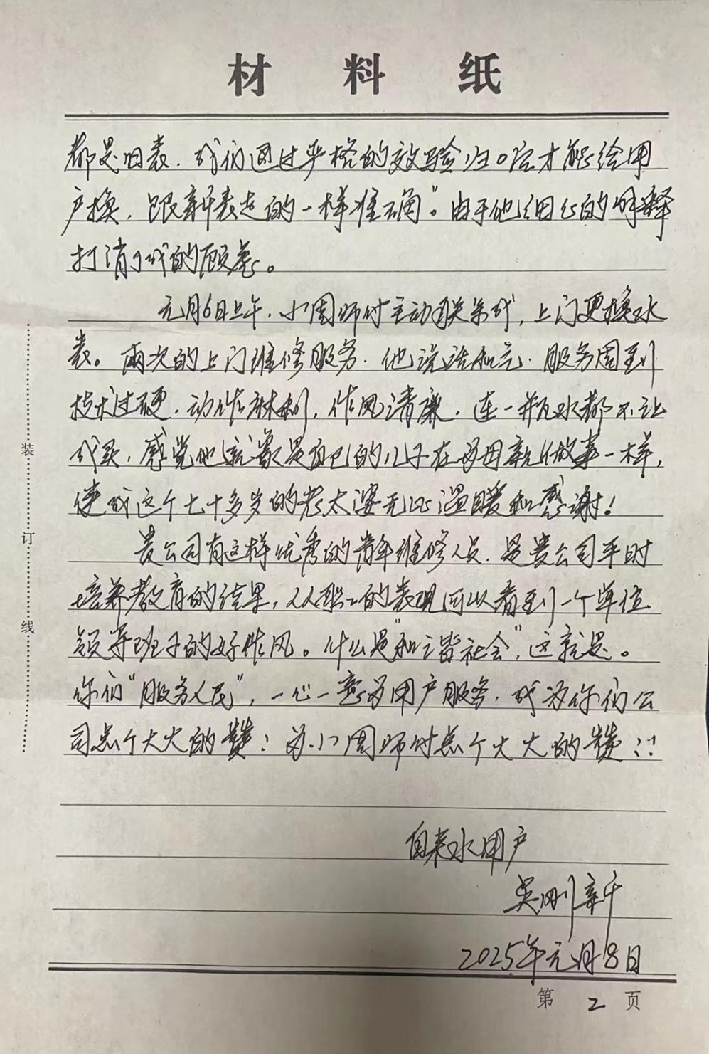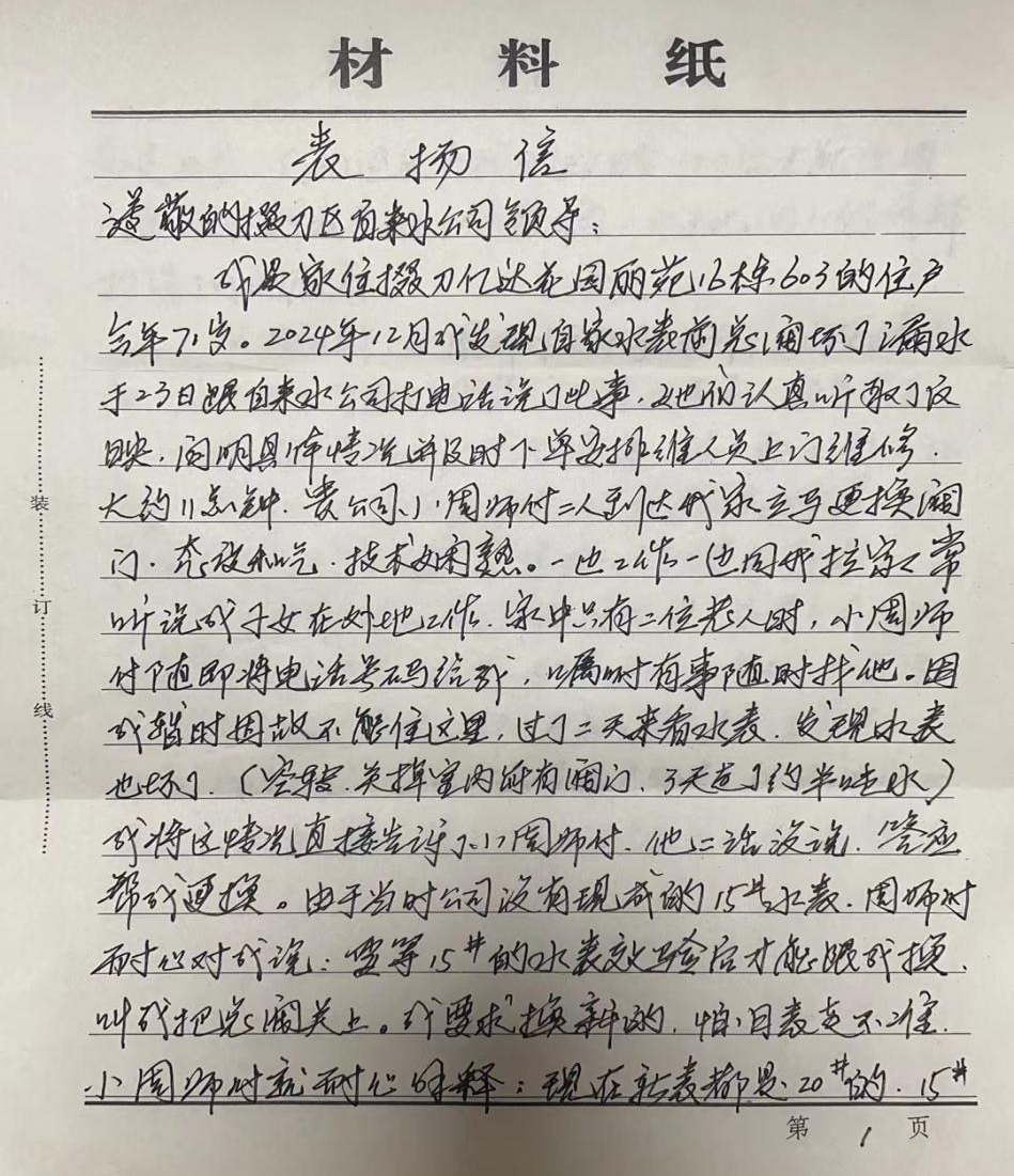 在表揚信中,老人深情表達:“家中只有我們兩位老人,水務集團的維修人員就像我們的兒子一樣,他說話和氣,服務周到,技術過硬,動作麻利,作風清廉,讓我們感到無比溫暖。”