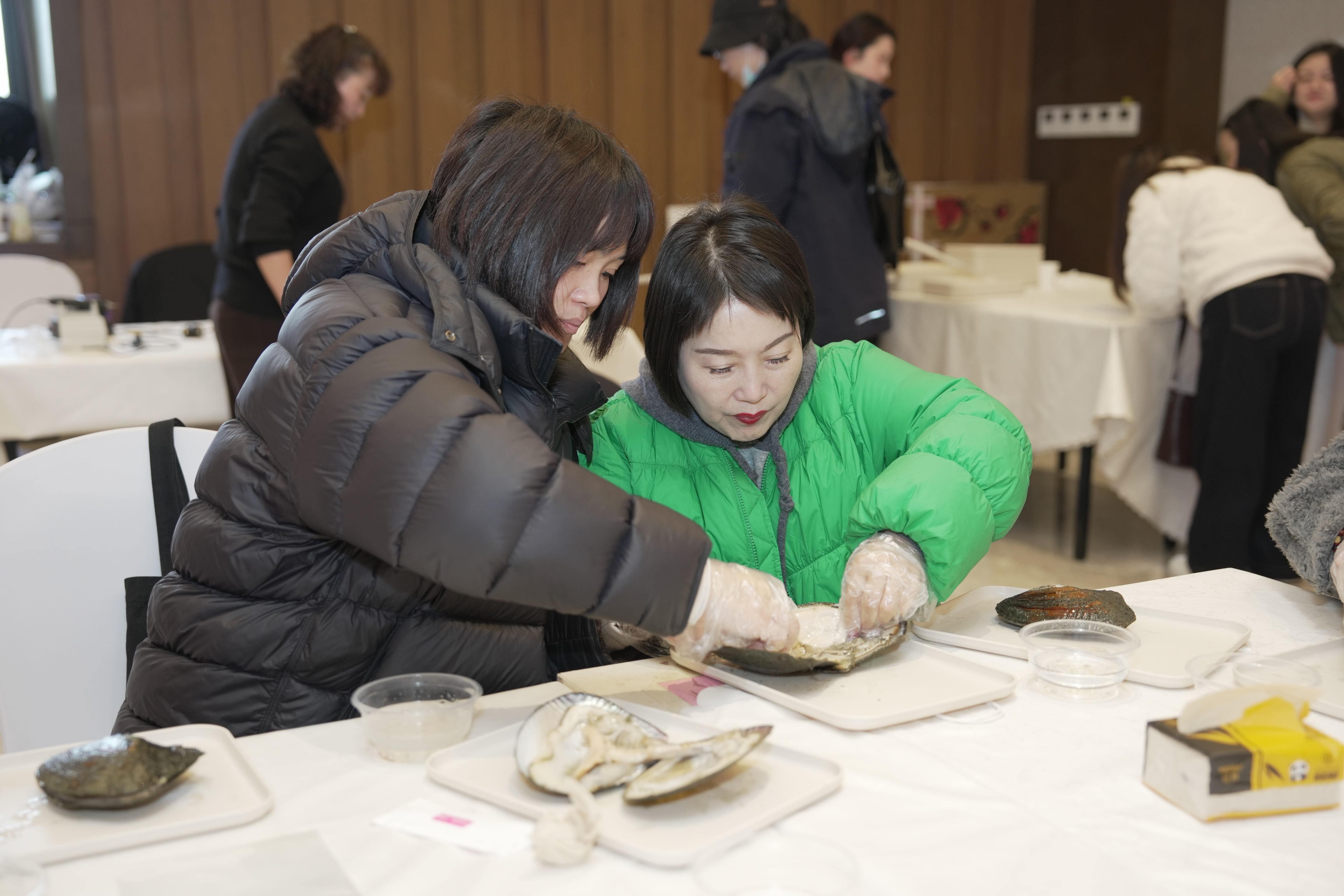 活動(dòng)開始,老師詳細(xì)講解了珍珠的形成原理、種類以及開蚌的技巧和注意事項(xiàng)。開蚌環(huán)節(jié),大家充滿驚喜與期待,戴上手套,拿起工具,探尋珍寶,大家直呼“開盲盒”的感覺(jué)真不錯(cuò)!