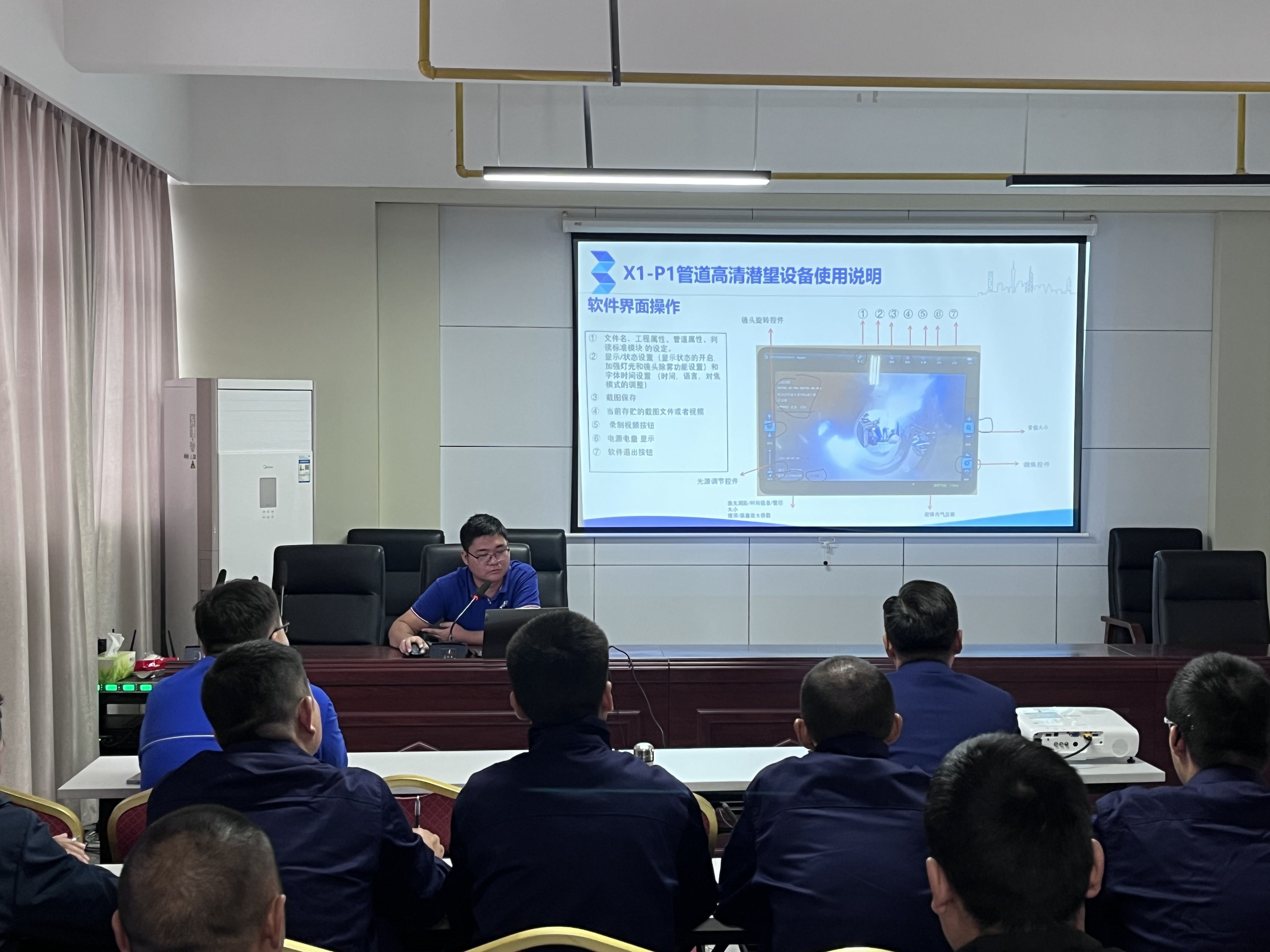 本次培訓采用“理論+實操”相結合模式。理論授課環(huán)節(jié),授課老師圍繞CCTV管道檢測機器人工作原理、設備結構組成、操作規(guī)范及安全注意事項等內(nèi)容,通過PPT展示和應用案例開展系統(tǒng)授課。參訓員工全神貫注,詳細記錄操作要點,積極與老師互動交流,對這位“新伙伴”有了初步的理論認知。