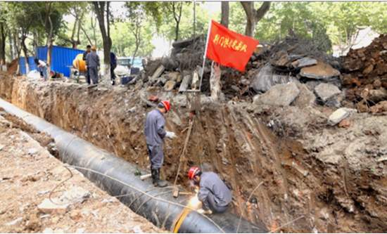 五月,象山大道、三條高速公路出入口道路綜合整治工程項(xiàng)目現(xiàn)場一派熱火朝天景象?!肮┧粨絷?duì)”的紅色旗幟在高高飄揚(yáng);頭戴紅色安全帽身穿藍(lán)色工作服的供水施工人員在緊張施工;挖機(jī)、吊車、發(fā)電機(jī)等大小機(jī)械設(shè)備一致排開;焊花飛濺、機(jī)聲隆隆、有條不紊、忙而不亂......這就是維修處施工人員奮戰(zhàn)在四條道路上進(jìn)行管道遷改的工作場景。