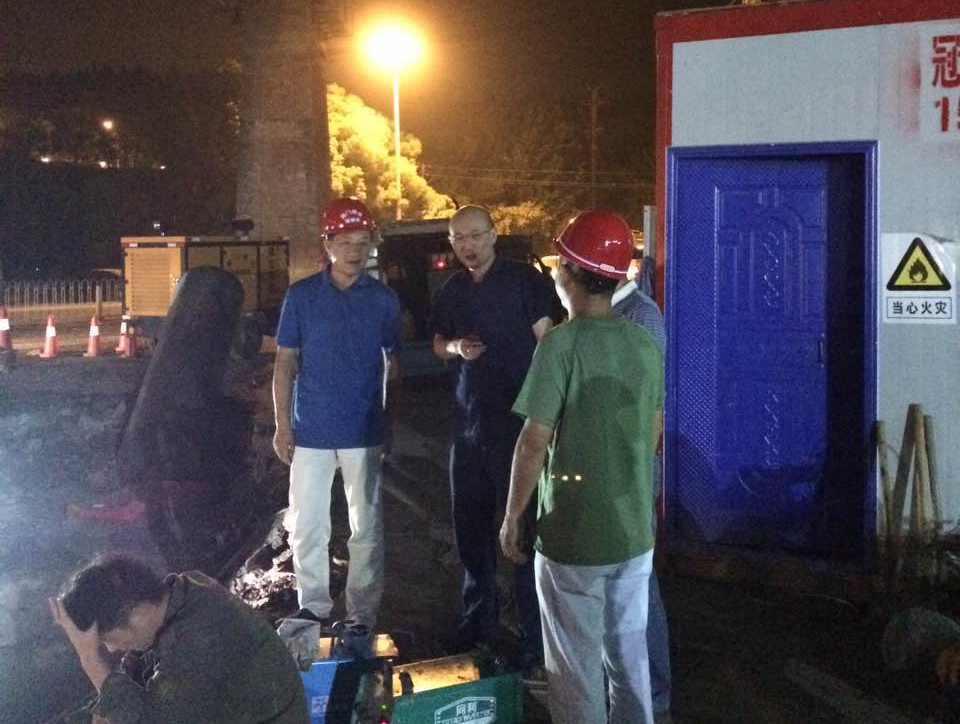 此次施工任務重、時間緊、戰(zhàn)線長、交叉作業(yè)多、未知因素多,市供水總公司科學組織、準備充分、措施有力,創(chuàng)造了荊門供水單次停水施工碰頭數(shù)量最多、停水時間最短的歷史紀錄!此次施工前,市供水總公司審時度勢,啟動了應急預案,從人員、物資、設備、應急搶險等各方面都做了充分準備。當晚,公司黨委書記、總經(jīng)理陳永根親臨施工現(xiàn)場,坐鎮(zhèn)一線指揮,要求相關部門集中力量,全力配合,爭取在最短的時間內(nèi)完成施工,盡快恢復供水。在爭分奪秒的施工過程中,全體參戰(zhàn)單位和人員在總公司領導正確指揮下,發(fā)揚"特別能吃苦、特別能戰(zhàn)斗、特別能奉獻"的“供水鐵軍”精神,團結(jié)一心,眾志成城,密切配合,群策群力,譜寫了供水人敢與時間賽跑、敢同困難較勁的“合奏曲”。維修公司、安裝公司、營抄中心工作人員作為搶修主力軍,在悶熱的坑洞下和污濁的泥水中實行分班作業(yè)、輪流施工,艱苦作業(yè)。職能部門管網(wǎng)運維部、工程管理部、客服中心、水質(zhì)檢測公司積極發(fā)揮統(tǒng)籌協(xié)調(diào)能力,調(diào)度應急供水車緊急供水、調(diào)配管材物質(zhì)、快速水質(zhì)化驗……竭盡全力地為DN1000管道碰頭施工保駕護航。