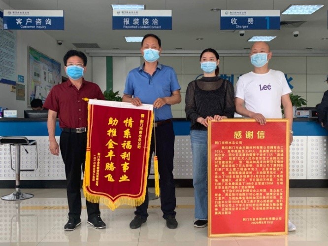 5月15日上午,荊門市金豐新材料有限公司總經(jīng)理袁家群和東寶區(qū)工商聯(lián)相關(guān)負(fù)責(zé)人來(lái)到市供水總公司,送上感謝信和寫有“情系福利事業(yè) 助推金豐騰飛”的鮮艷錦旗,以感謝市供水總公司想企業(yè)之所想、急企業(yè)之所急,用實(shí)際行動(dòng)踐行初心使命,助推企業(yè)復(fù)工復(fù)產(chǎn)。