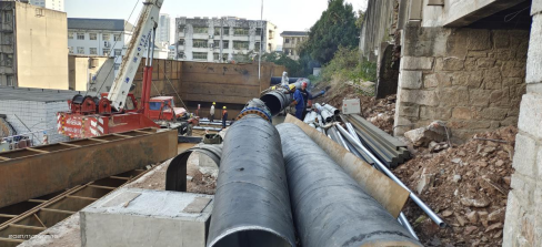 潤(rùn)澤建設(shè)公司現(xiàn)場(chǎng)負(fù)責(zé)人曾張進(jìn)介紹:一水廠處于市區(qū),廠區(qū)內(nèi)空地小,施工場(chǎng)地受限,有些管道的安裝機(jī)械施展不開,只能靠人力來完成,比如DN500排泥管安裝在沉淀池底座的懸挑板下面,機(jī)械臂無法到達(dá),只能用起重葫蘆安裝,而DN800進(jìn)水管沿山邊支設(shè),管網(wǎng)開挖、鋪設(shè)難度也較大;同時(shí),配套管網(wǎng)的安裝和沉淀池箱體的施工交叉施工,進(jìn)一步增加了施工難度。